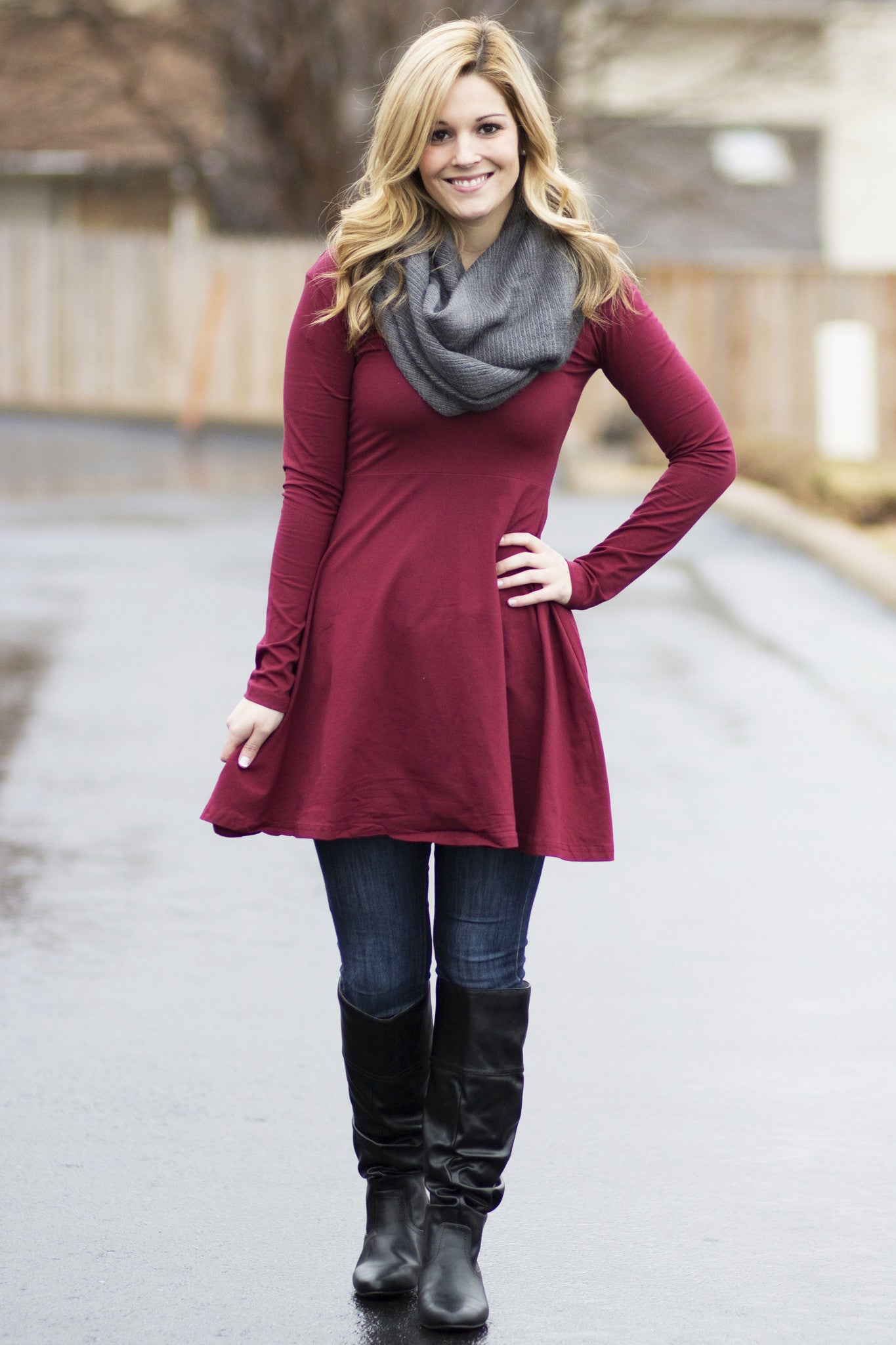 This burgundy dress is fun and flirty! You can wear it multiple ways. Pair it with a scarf and leggings to be cozy or throw on your favorite boots and accessories for an evening out! This dress is fitted and has a super cute neckline! Model is 5'3" wearing size small.