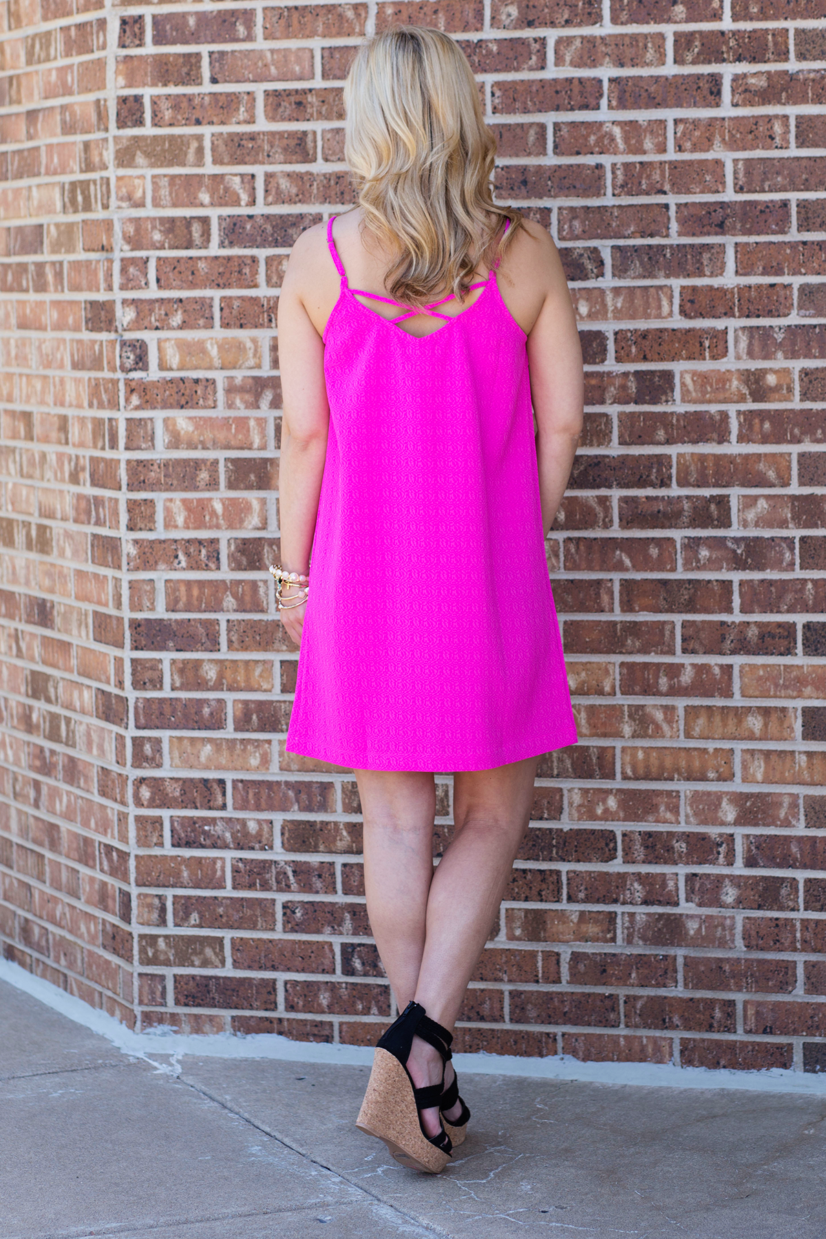 This shift dress is one for the books! It's thicker polyester fabric and gorgeous, rich color makes it one of our favorite spring dresses. The straps are adjustable and this dress has room in it.