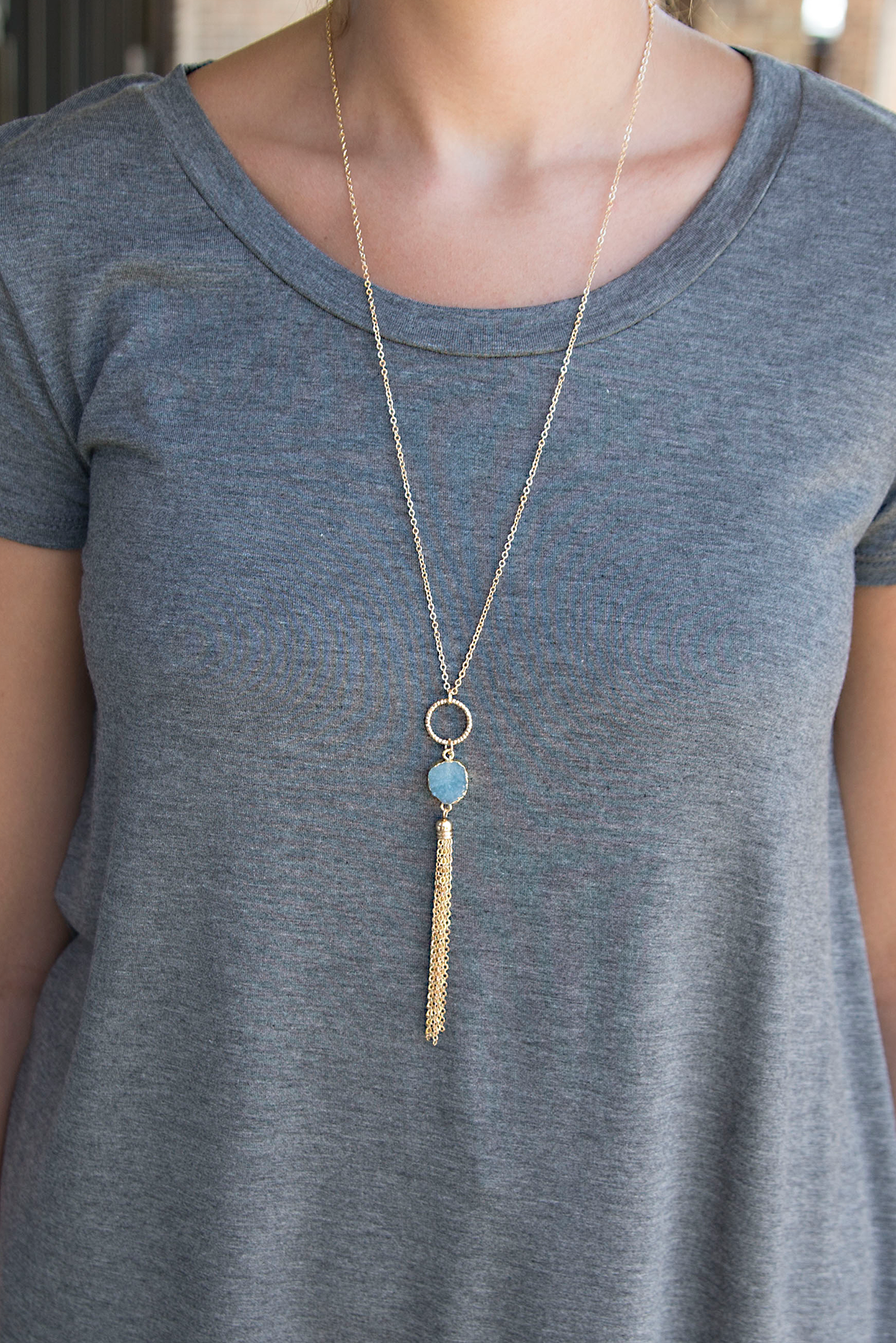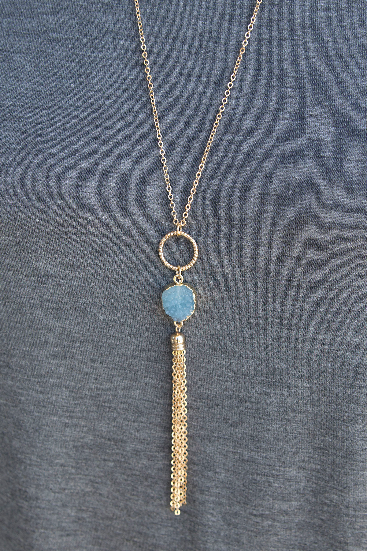 We are in love with this long blue druzy tassel necklace! It is the perfect necklace to add just a little pop of color to your outfit! It's not too over the top but not too dainty, it's sure to be the cutest accessory to throw on with your favorite top! This necklace measures approximately 17.5" from the top to the bottom of the tassel. Attached is a 3" extender.