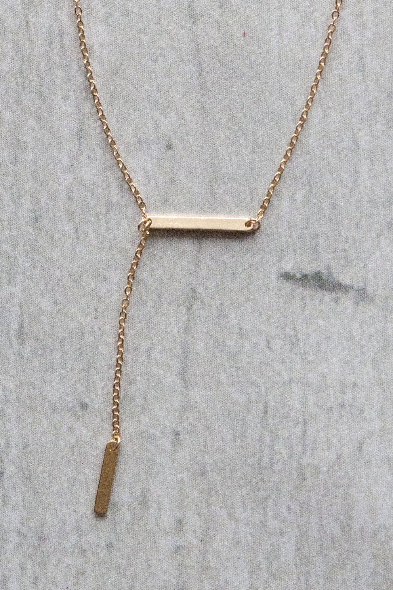 This dangling gold bar necklace hangs short around the neckline. It is simple and cute. It would make the perfect addition to any outfit!