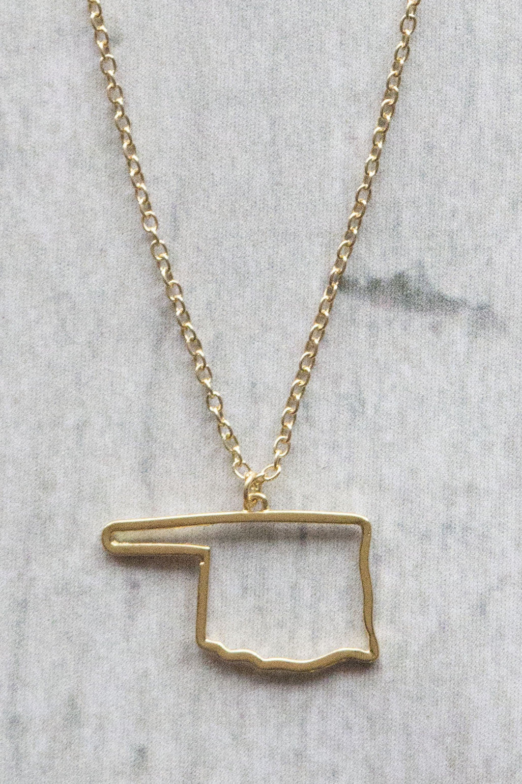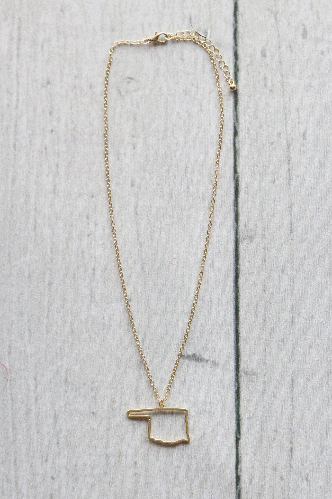 Show some state love with an outline of Oklahoma around your neck! This necklace is so cute to wear on game day or everyday!