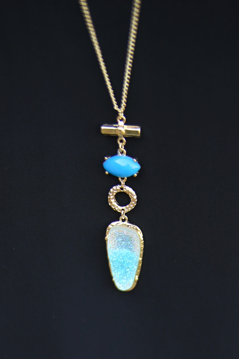 What is cuter than a blue druzy statement necklace? A long layered one! These necklaces have paired so well with almost anything to give your favorite top a pop of color! The top stone is light blue and has the cutest ombre look in the bottom pendant. The shorter layer of the necklace measures approximately 12" and the long layer measures 17.5" from the top to the bottom of the ombre pendant. It has a 3" extender attached.