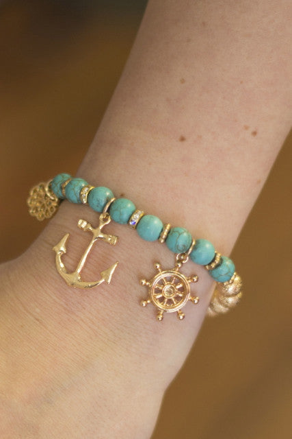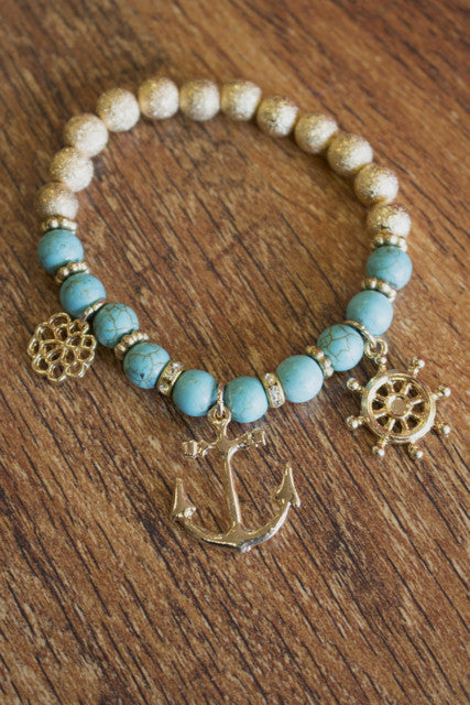 This beaded bracelet is half turquoise half shimmer gold beads with three nautical charms including an anchor.