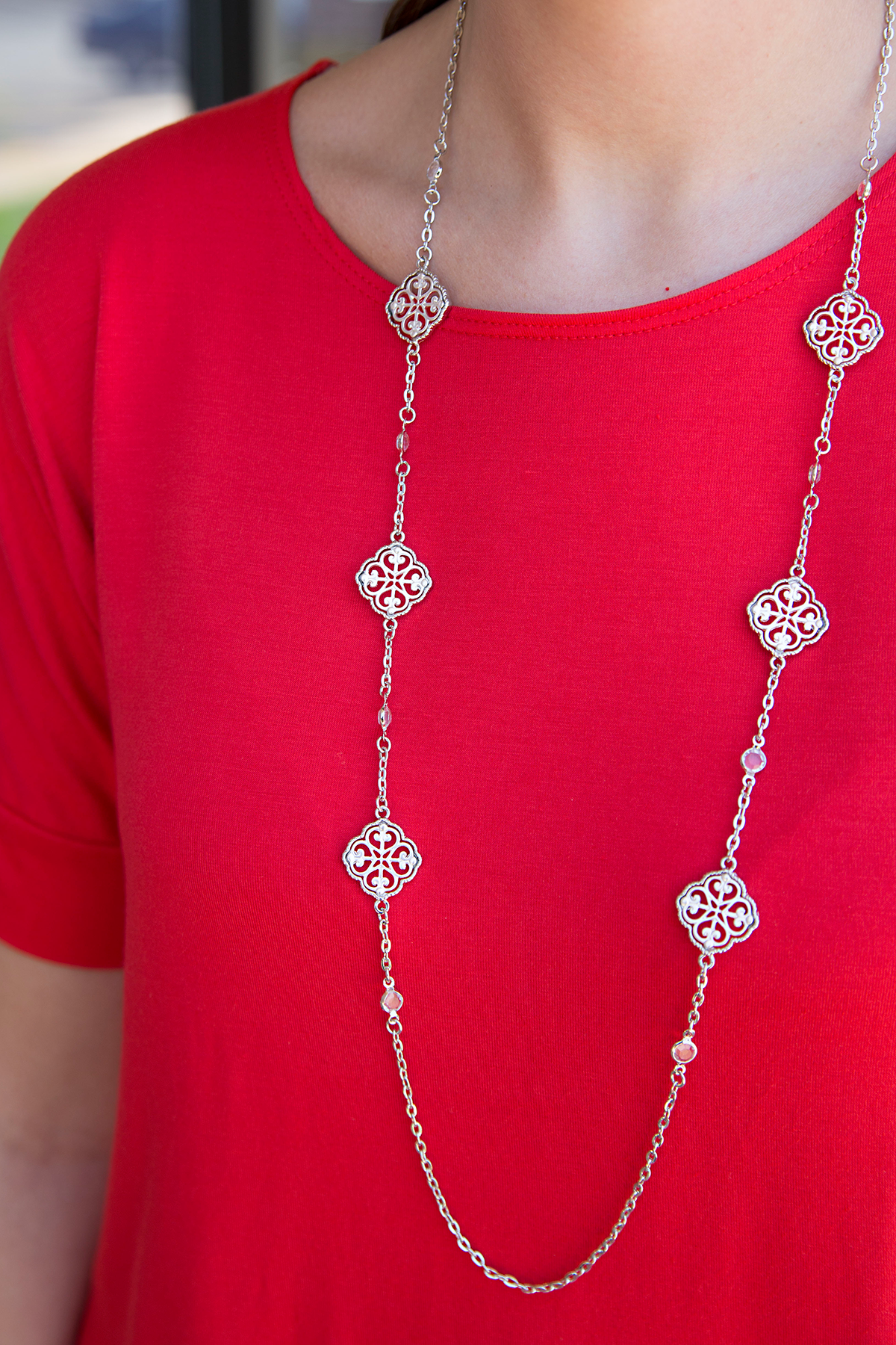 This silver ornate necklace is great if you're going for the simple look! It can be worn casually or dressed up for a night out. This necklace measures approximately 18" from top to bottom.