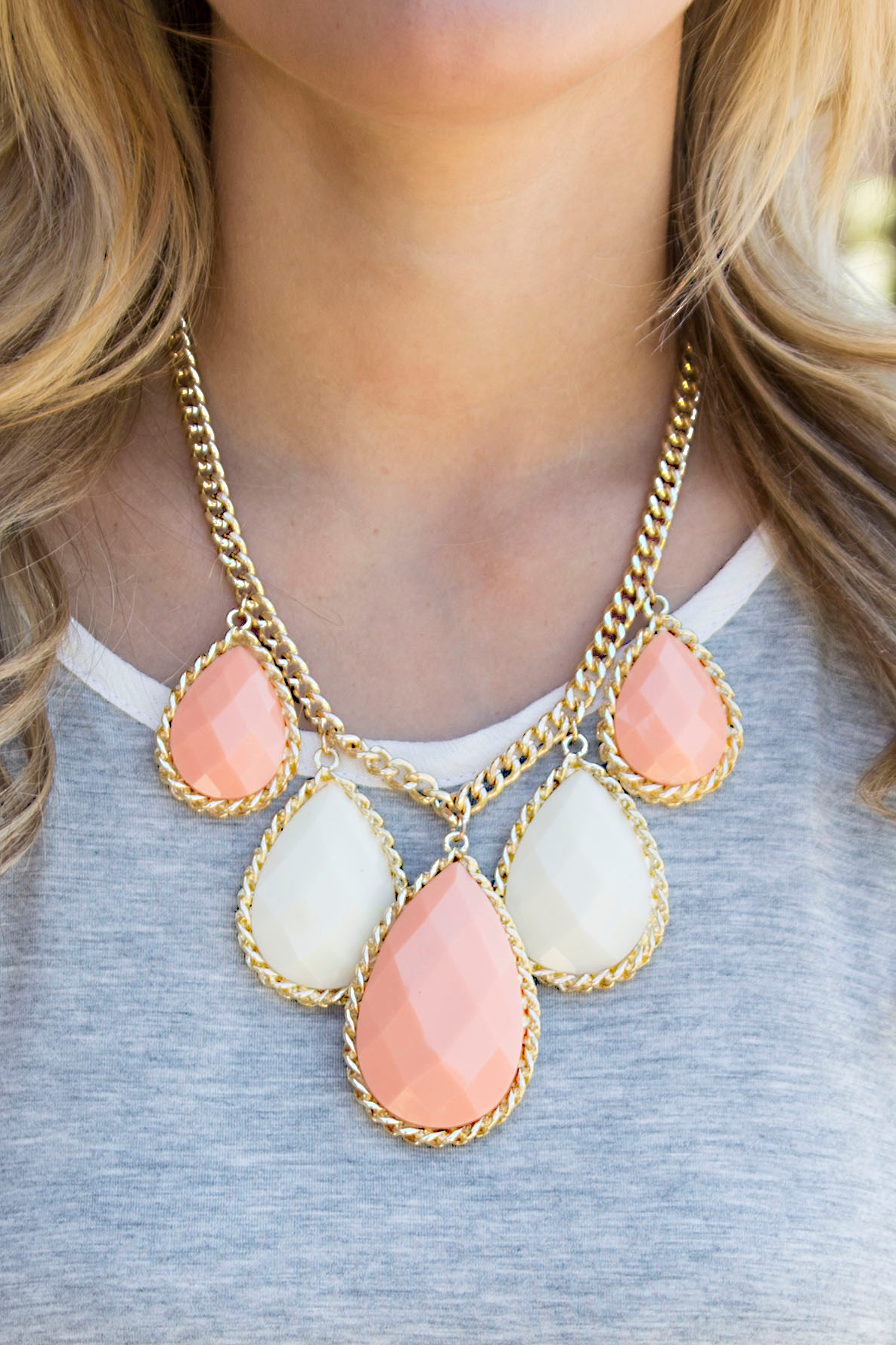The mixture of peach and ivory teardrop necklace will sure to make a statement. The largest gem measures approximately 2.5" and the smallest approximately 1.5". Length measures 16.5" inches with 3" extension.