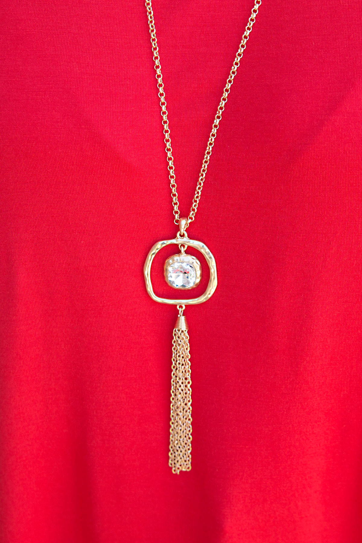 Dazzle up your look with this rhinestone pendant necklace! The gold pendant with the square rhinestone will look great with anything. We love anything with a tassel so we're obsessing over this necklace! This necklace measures approximately 19" and has a 3" extender attached.
