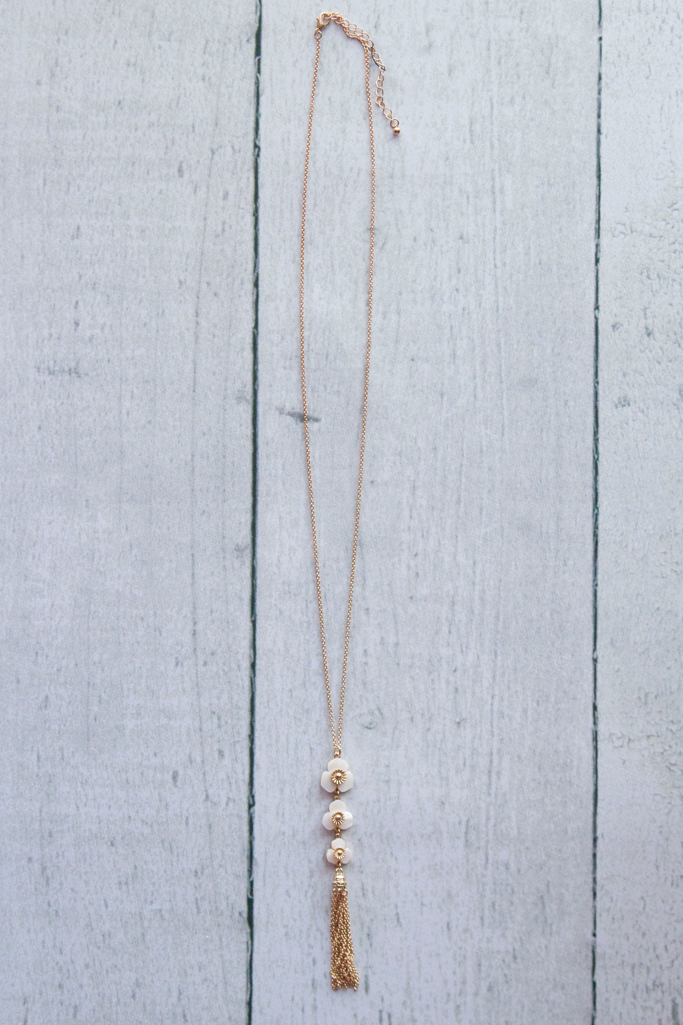 This long necklace is the perfect addition to your outfit. The stacked flowers are fun and it's a necklace you can wear year round. The tassel at the bottom is the perfect finish. This necklace is adjustable.