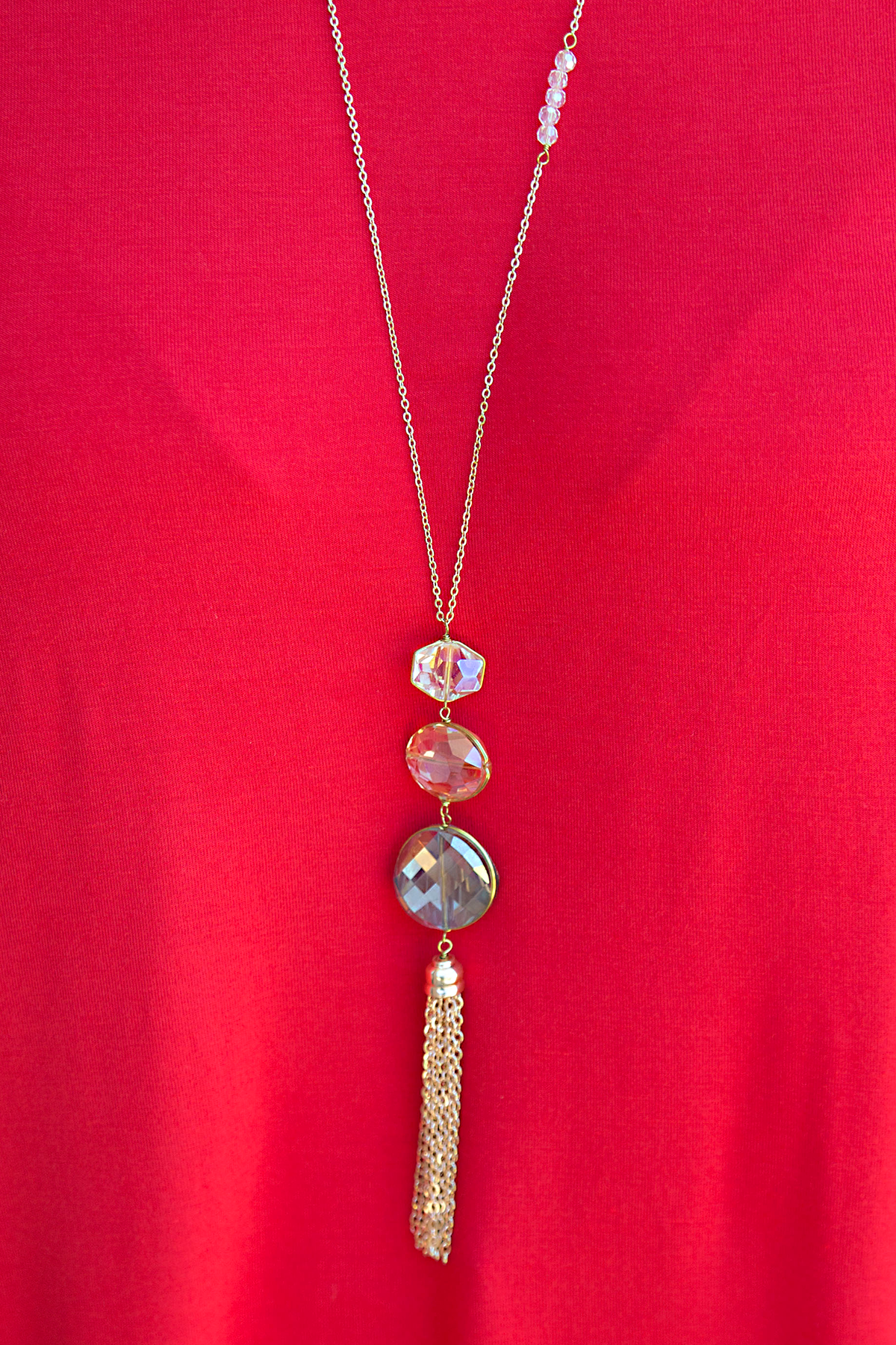 We are loving this triple bead stacked necklace! The blue and iridescent stones look so cute together and will pair with almost anything! This necklace measures approximately 20" from the top to the bottom of the tassel and has a 2" extender attached.