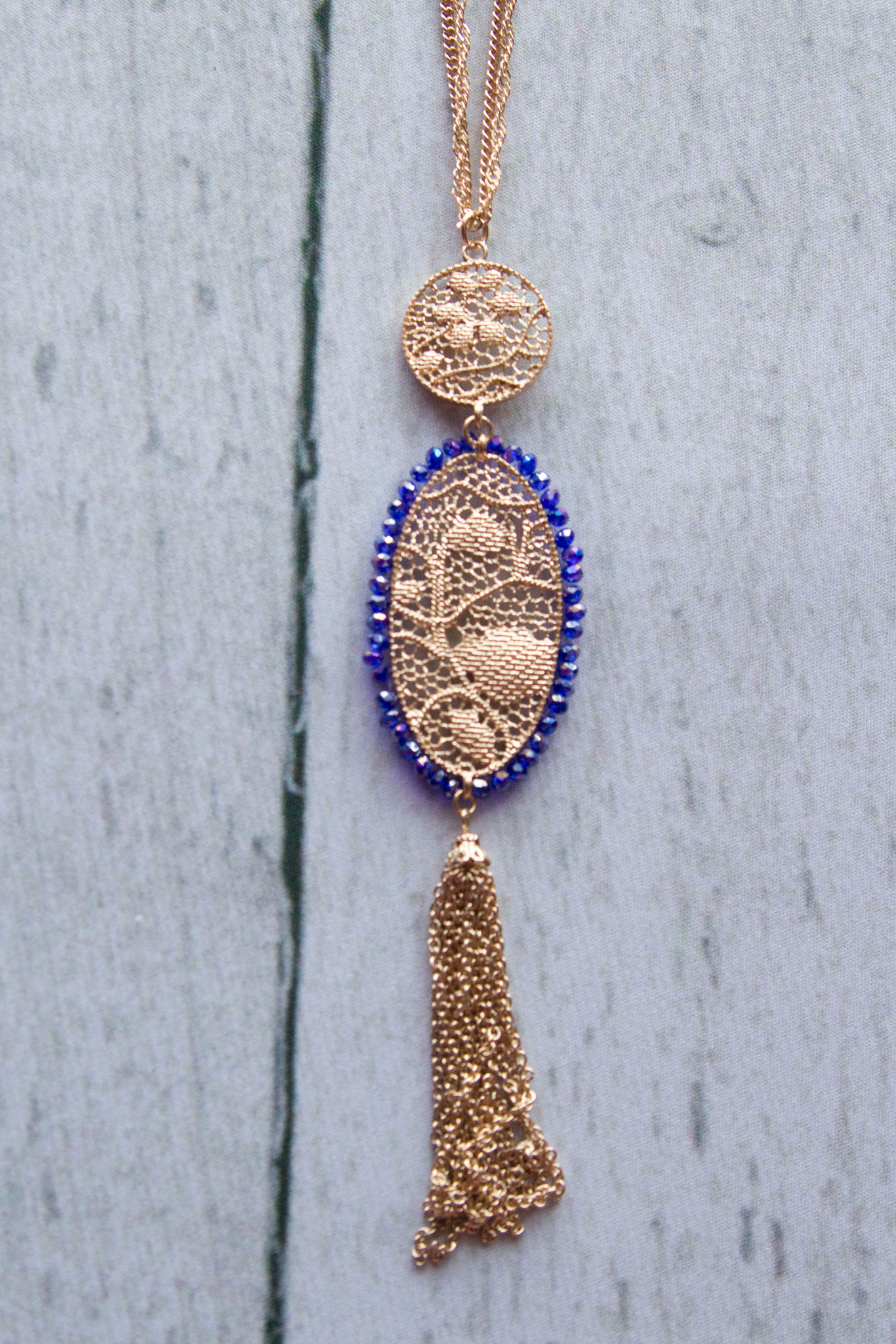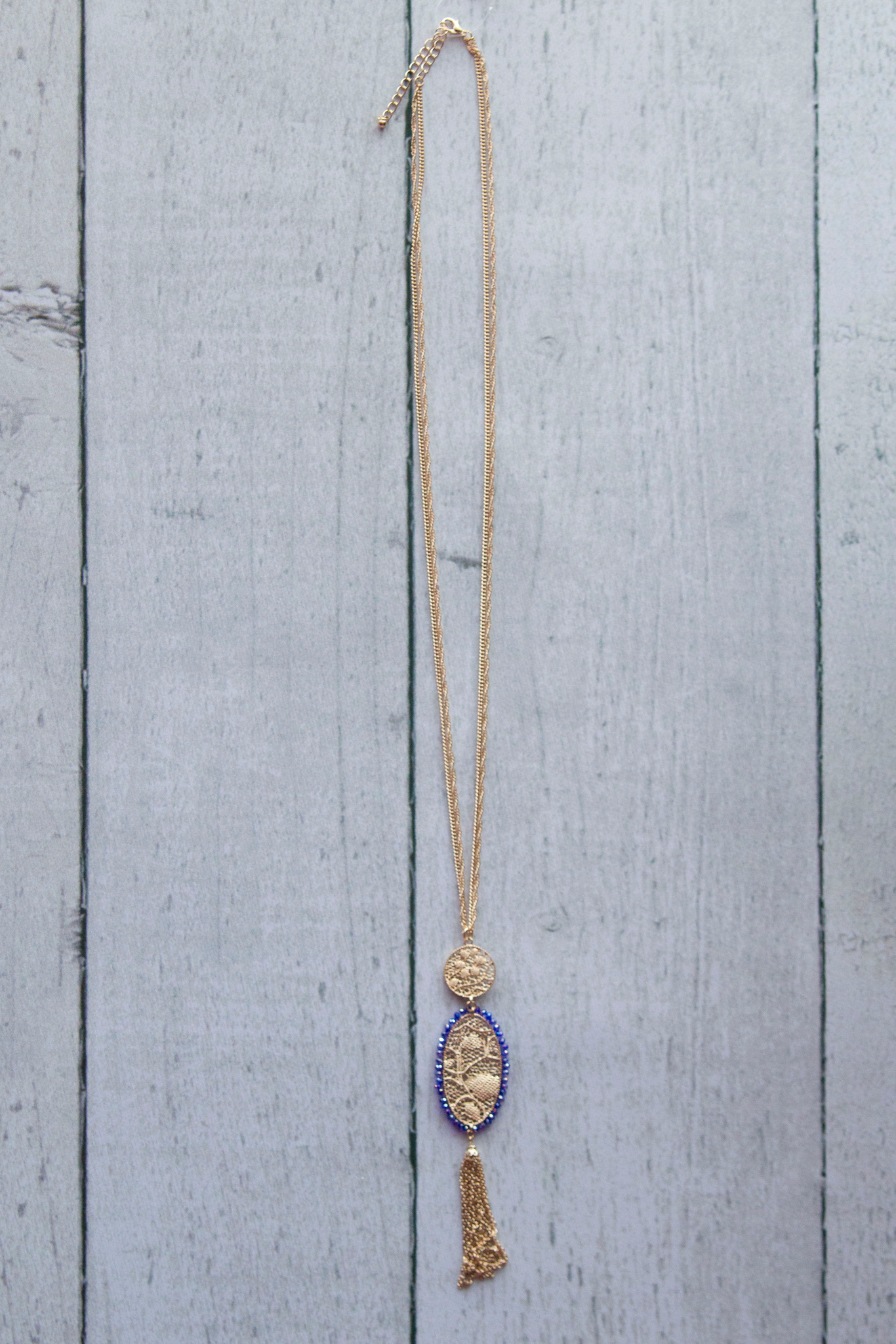 This gold two tiered necklace with blue iridescent beaded detail is so cute. Perfect for adding a little more color to your outfit of the day! It has the cutest tassel at the bottom to complete the look!