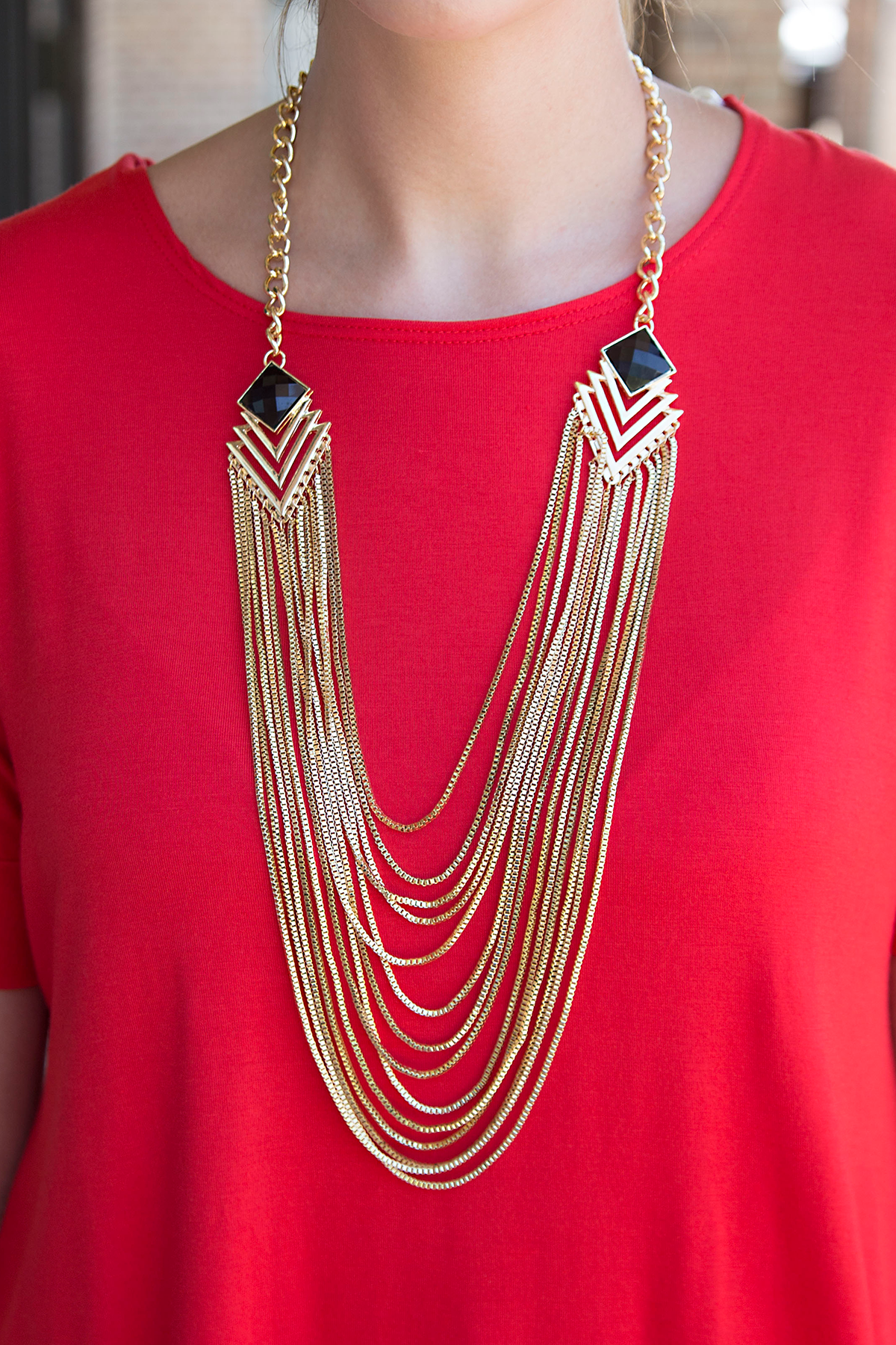 We love the detail on this Egyptian layered necklace. The black acrylic stones look adorable attached to the gold chevron and the layered chains add the cutest finish! This necklace measures approximately 16.5" and has a 3" extender attached.