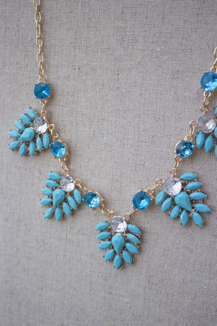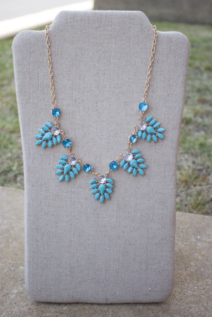 This aqua flower petal gem necklace has a mixture of acrylic stones and rhinestones making it a statement necklace you're friends will drool over. Measures 17.5" with a 3" extender.