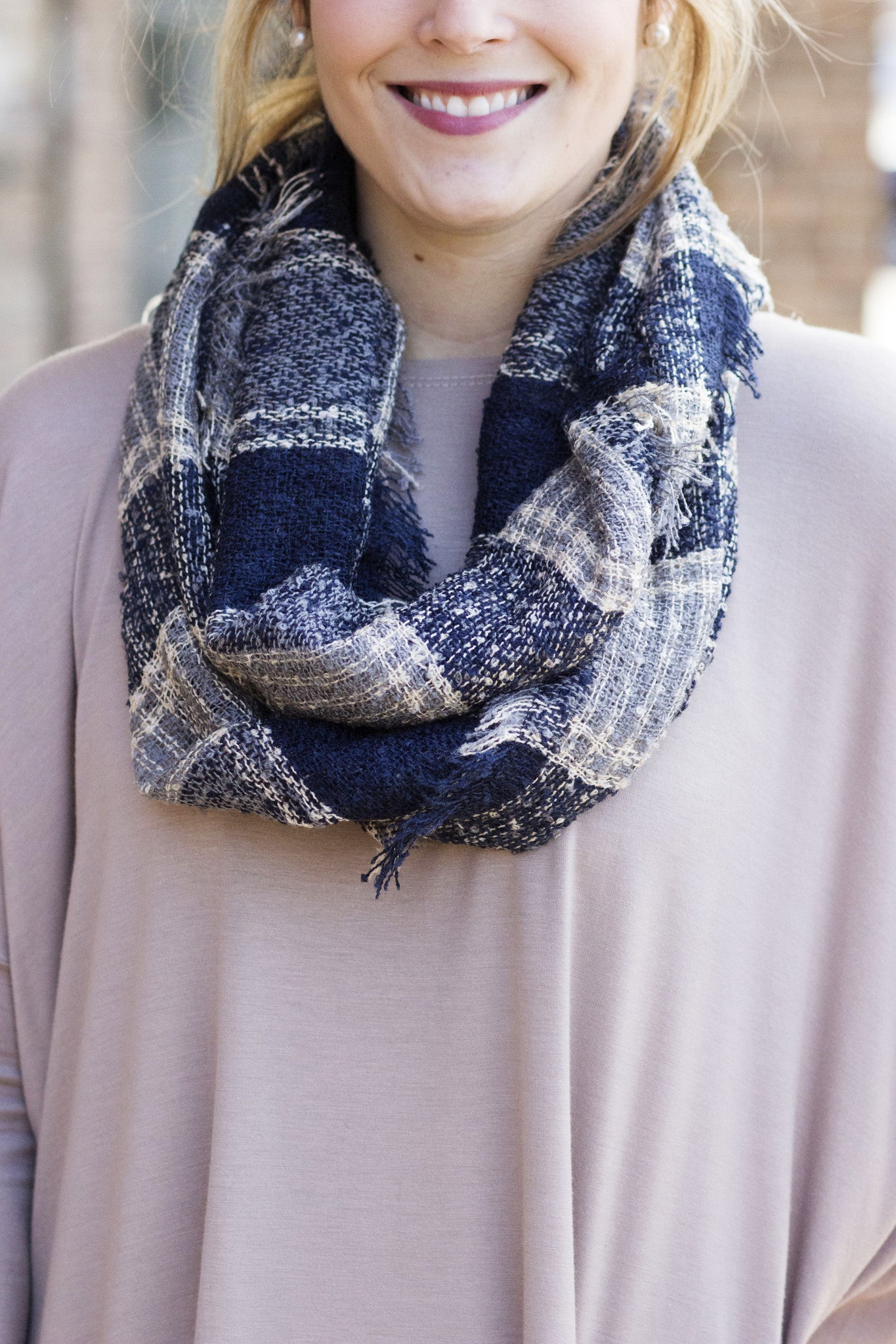 This frayed edge navy infinity scarf is right on trend with fall and winter fashion. Measuring 33" x 22" it lays perfect and is just the piece you need to pair with your favorite sweaters.