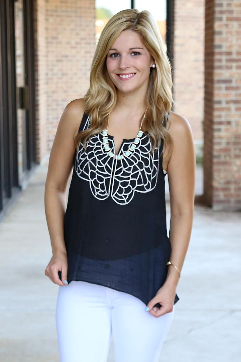 Want to feel pretty while being dressed comfy? This black beauty top is a winner in that category. We love the thin, cool material for those hot days and warm nights. Dress it up with some white jeans and wedges and you're set for date night. The model is 5'3", wearing size small.