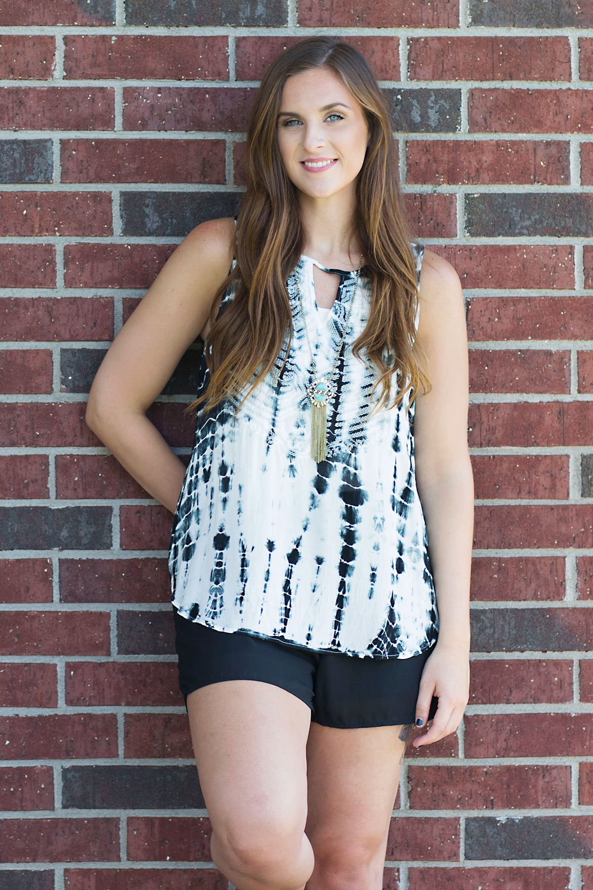 This edgy chic black and white tie dye top is perfect! We love not only the simple neutral colors but the white embroidered detail. This light weight top is great for the warm summer days that are ahead! This top fits true to size. The model is 5'5", wearing size medium.