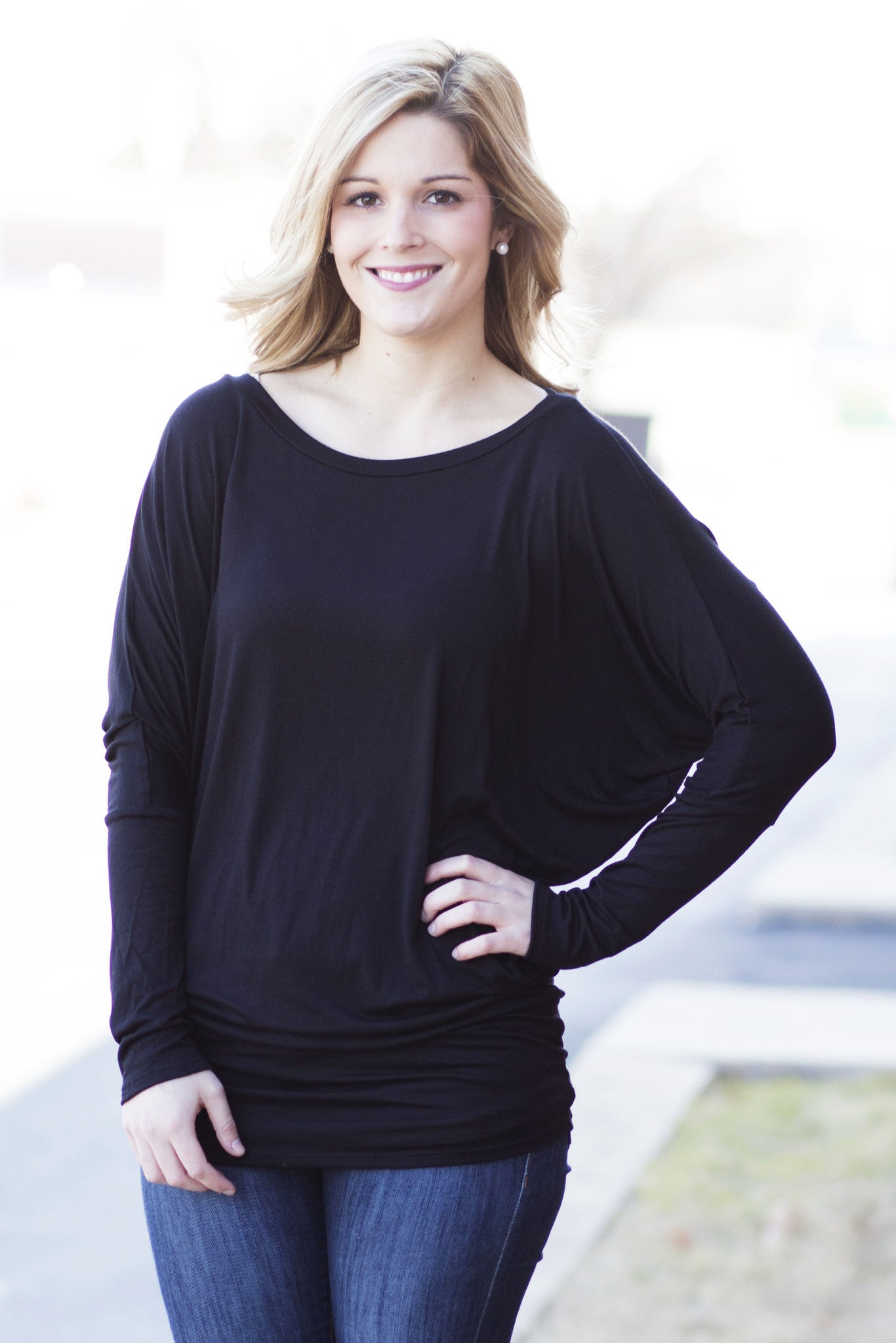 This black comfy dolman is one of our best selling tops. This top is stretchy but fits slimmer at the bottom. You can adjust it to your liking. The model is 5'3" and is wearing a size small. The large in these can fit up to 1X.