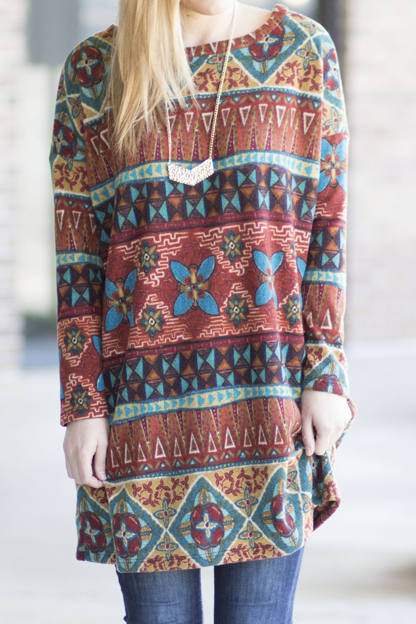 This fleece comfy tunic is on trend with it's tribal pattern and long enough length to wear with leggings. Pair it with your solid fleece leggings or favorite skinny jeans with riding boots. This is an oversized top.