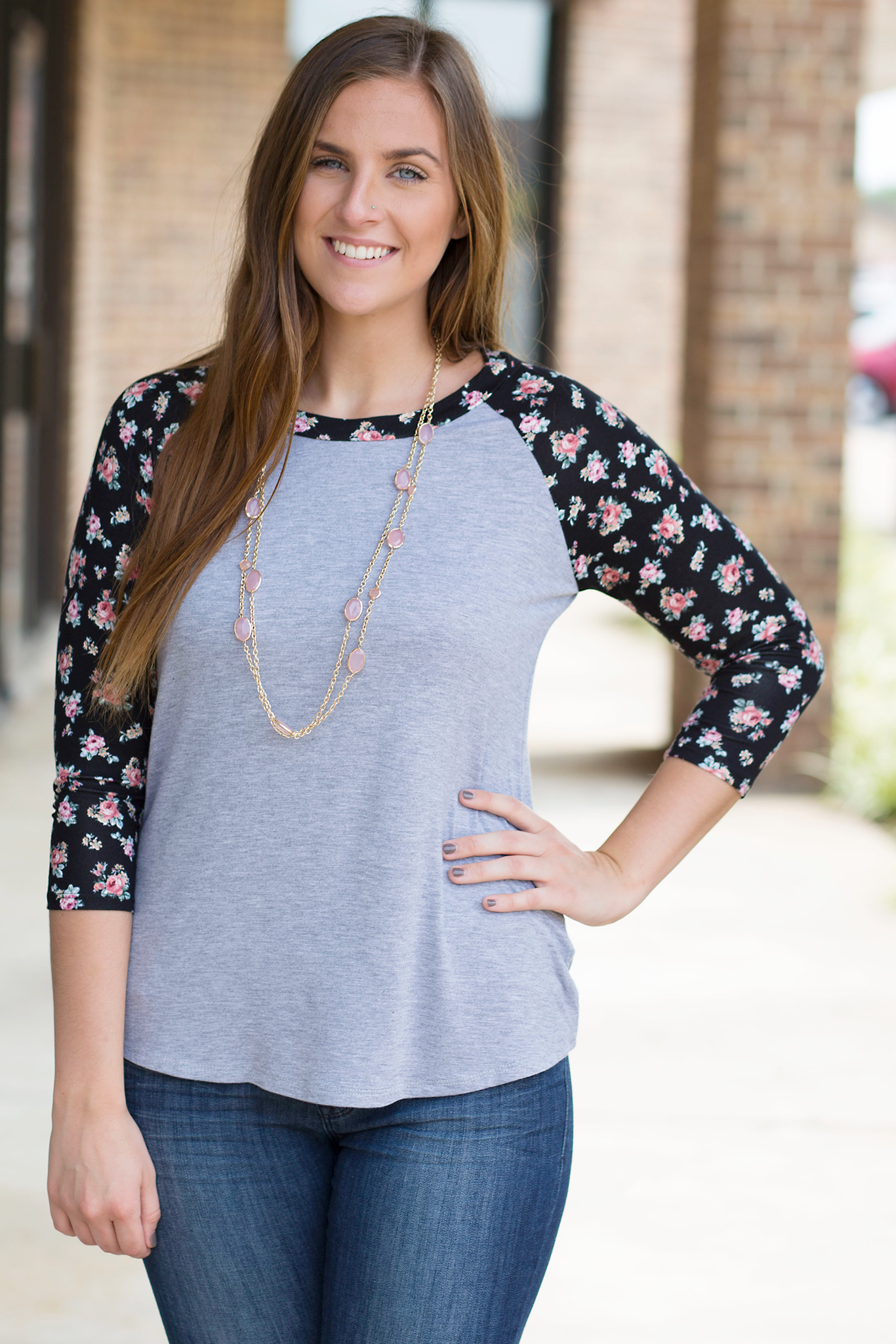 This is one of our absolute favorite tops in-store and online! This gray floral baseball tee is the perfect look if you're going for cute and comfy! Throw on a necklace or wear it by itself! This top fits true to size. The model is 5'3" wearing size small.