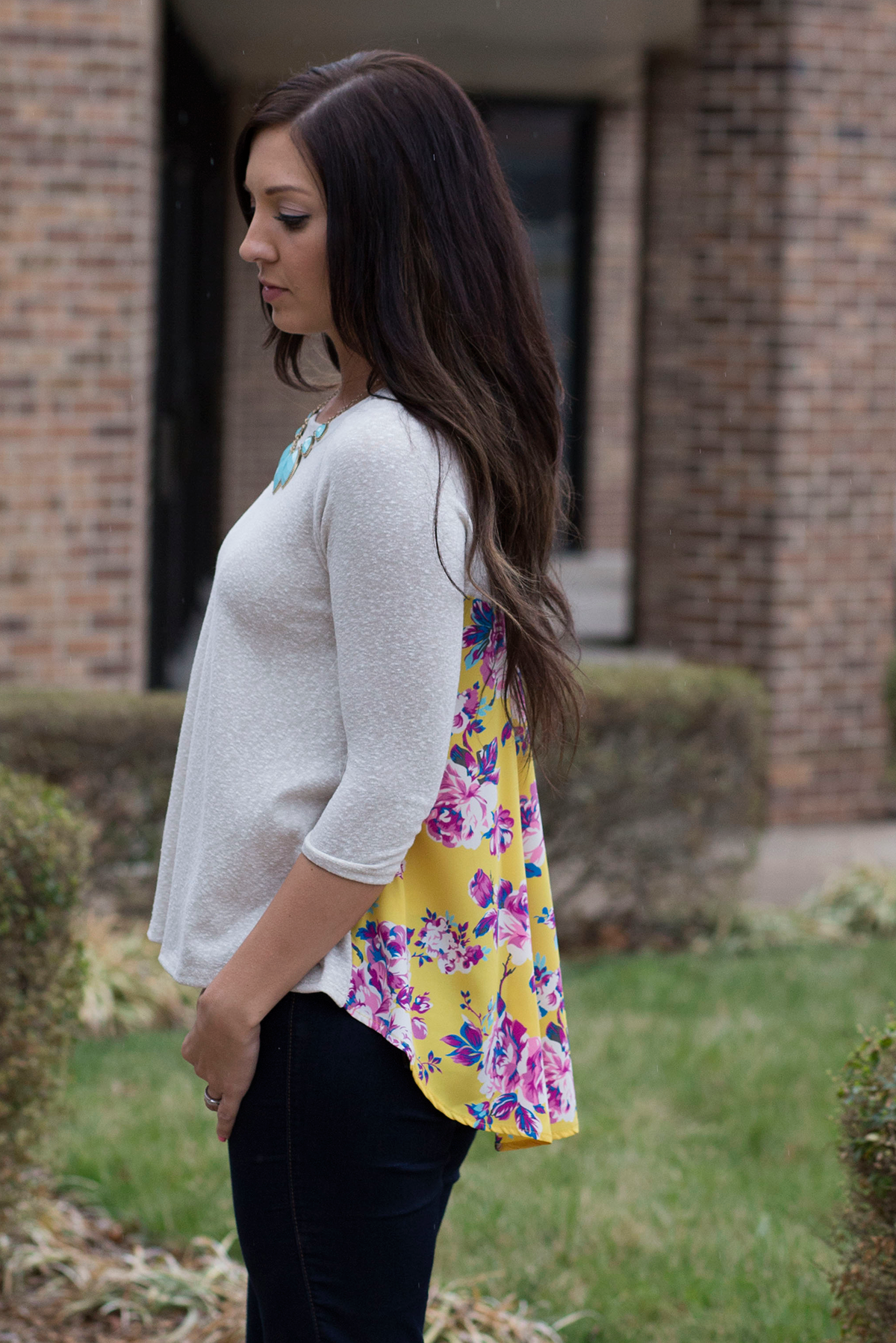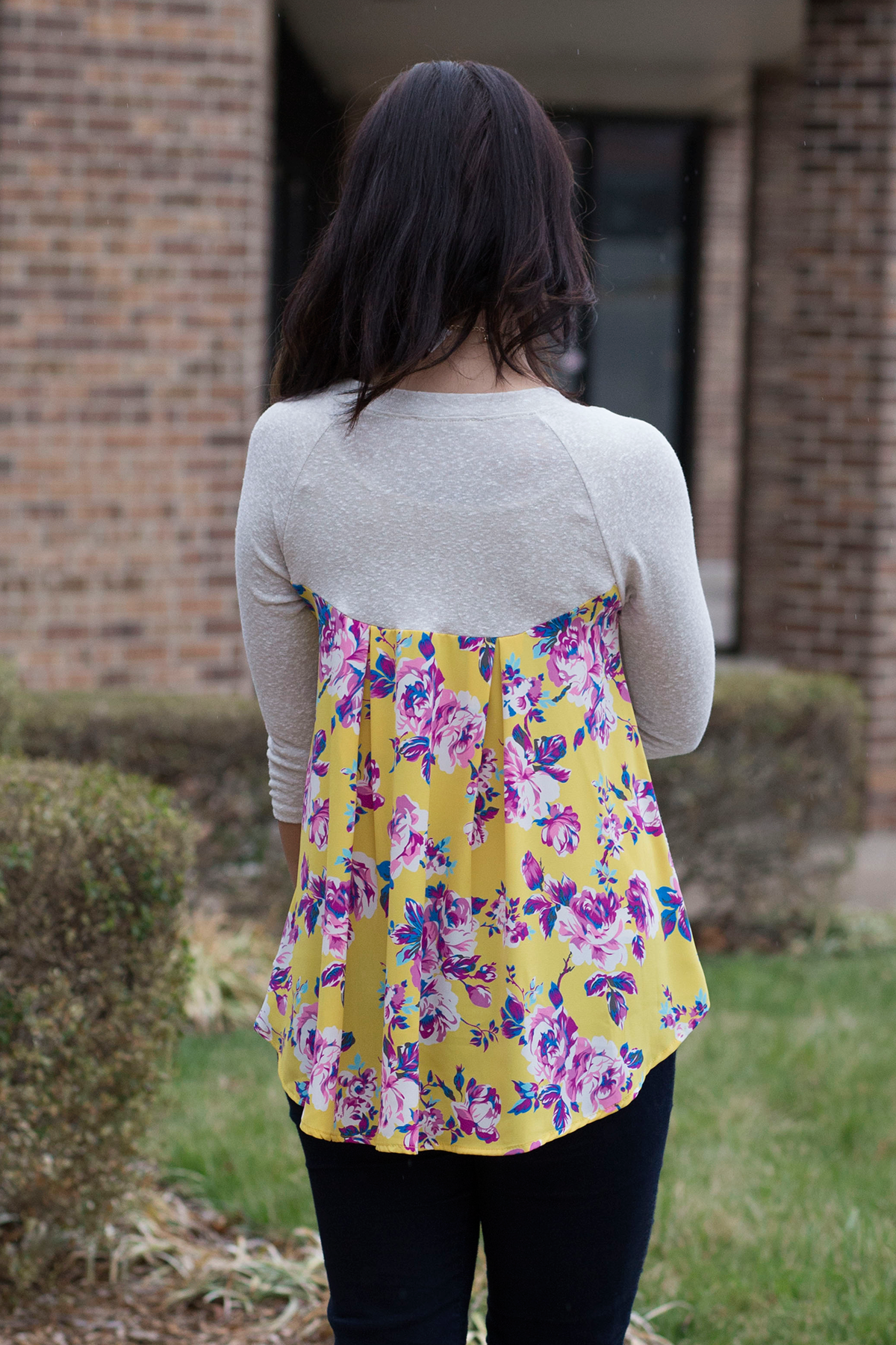This yellow and gorgeous rich color combination is making this top one of the best tops for spring! Wear this for a casual afternoon lunch or pair it with your favorite wedges for a special event. This top fits true to size. It does fit shorter in the front and longer in the back. The model is 5'7" wearing a size small.