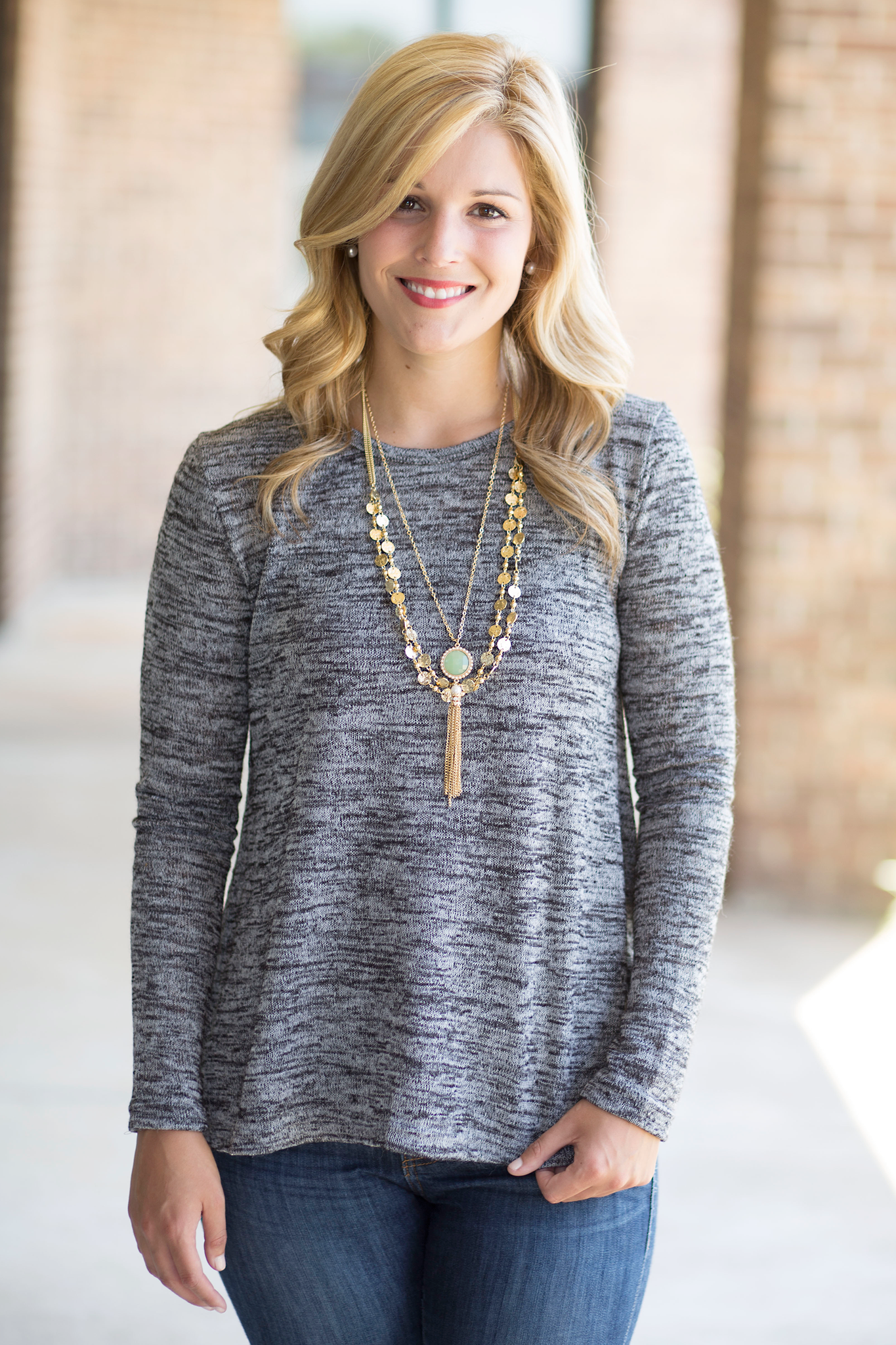 We are obsessing over this lace back sweater! This sweater is the perfect neutral to pair with any accessories and the back has the most adorable lace detail! We put a charcoal camisole underneath to make the details really pop! This sweater fits true to size. The model is 5'3", wearing size small.