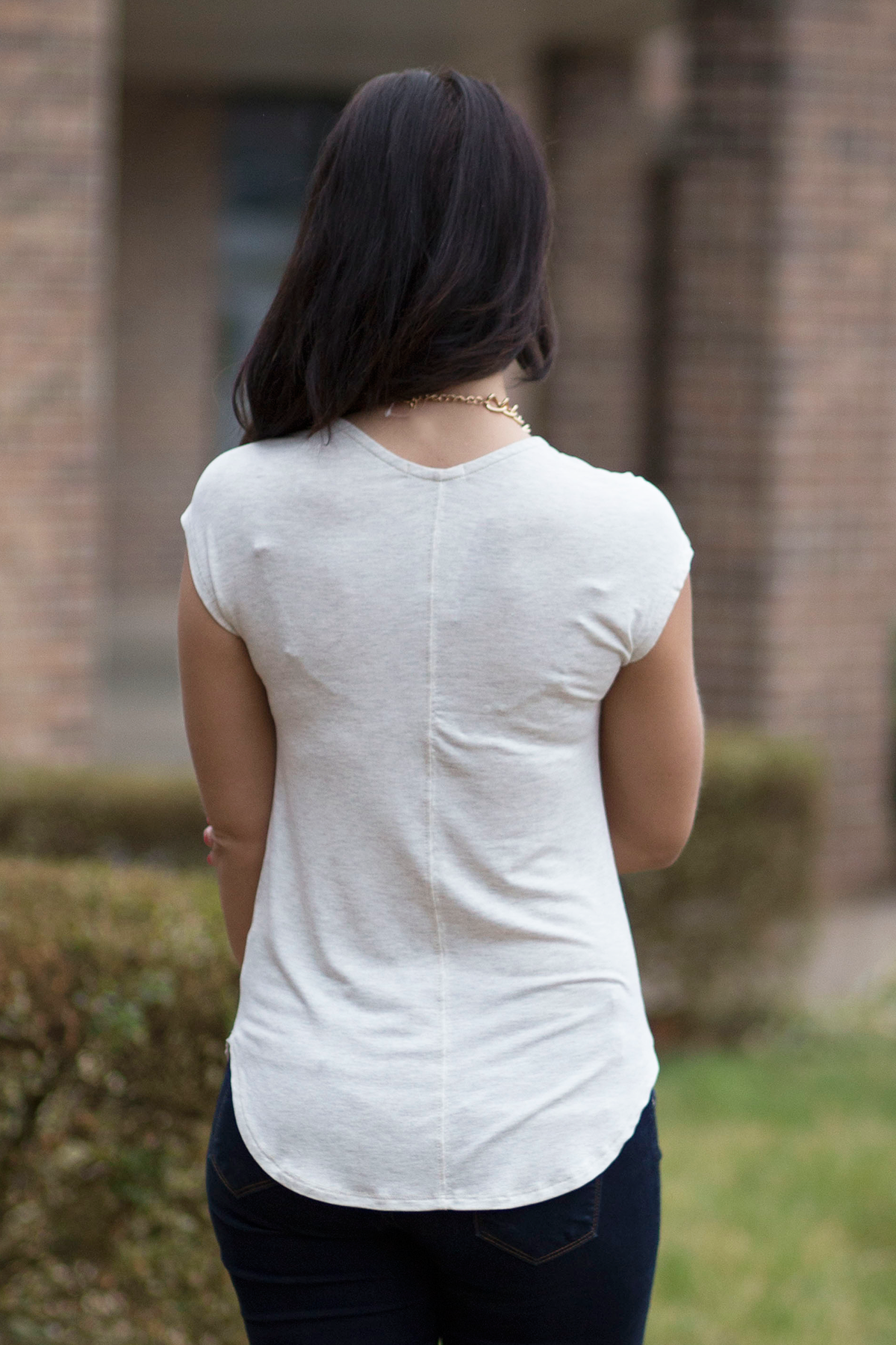This oatmeal pocket tank is a great staple piece to wear for spring and summer. Wear it under your favorite lightweight cardigans for spring. This top is fitted. Model is 5'7" wearing size small.