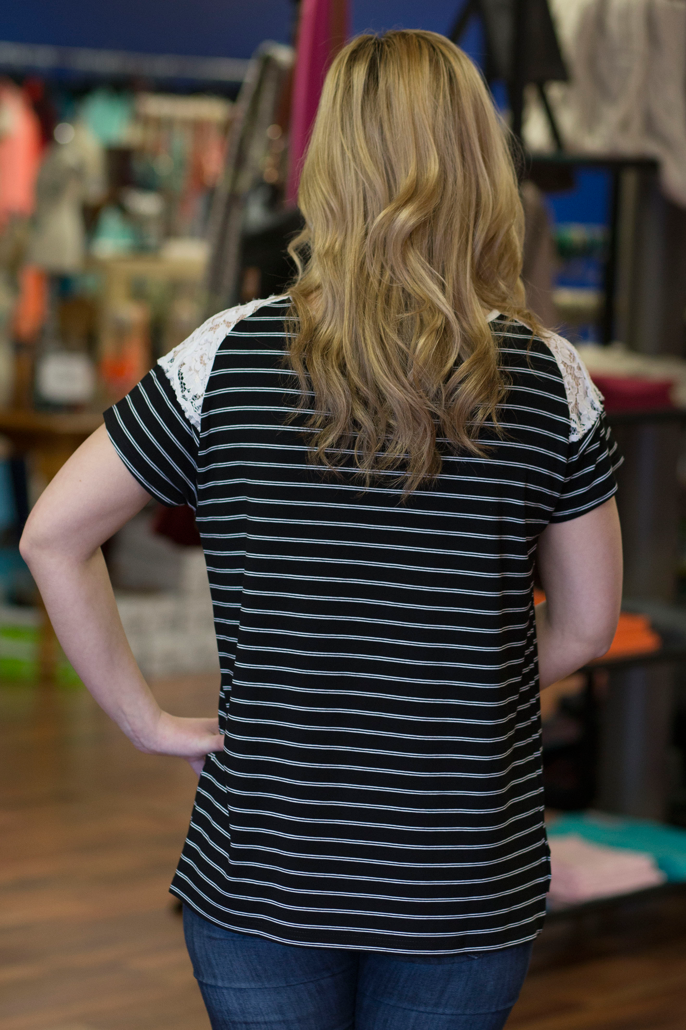 This black and white striped top is perfection combining two our of favorite trends: stripes and lace! This top is fitting true to size and is a stretchy material.