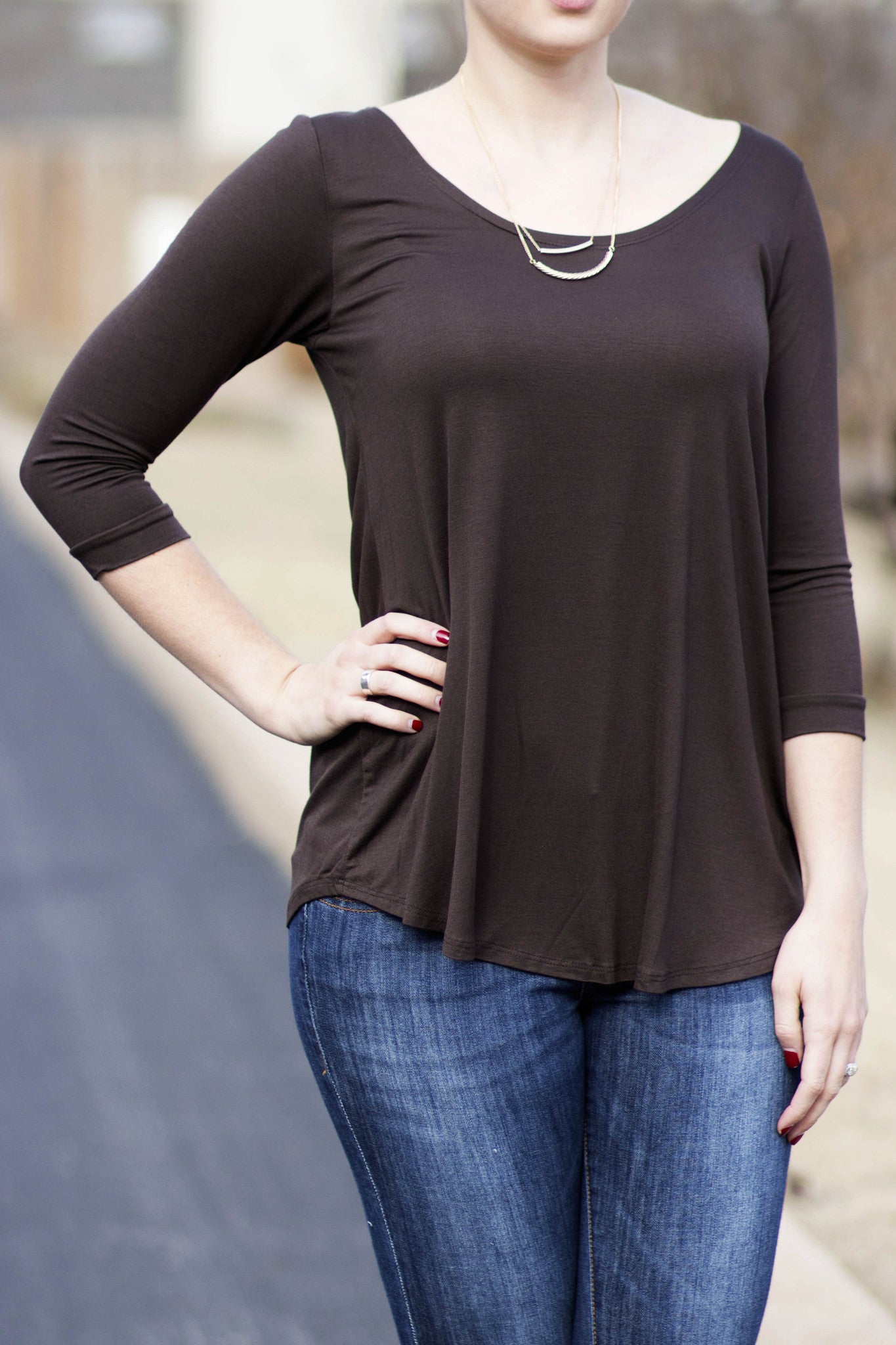 This dark brown tee is one of our best-selling tops because it is so easy to wear with many different outfits. Now it's available in this 3/4 length sleeve! It's a scooped fit at the bottom so you can tie it up to wear it with a maxi skirt or leave it long with your favorite jeans for a casual day out. Fits true to size.