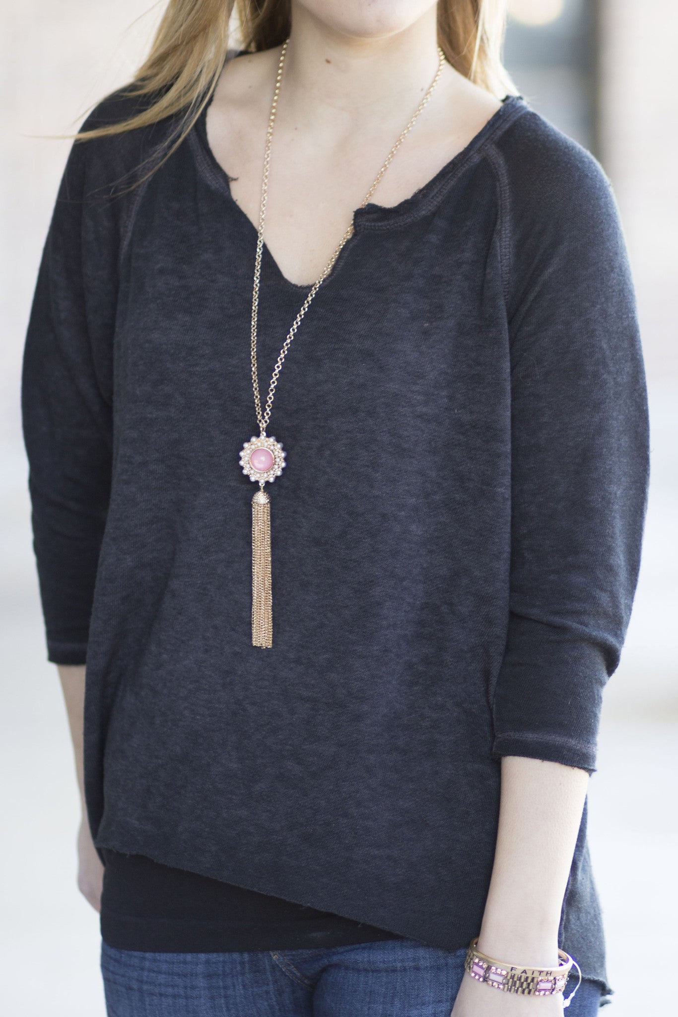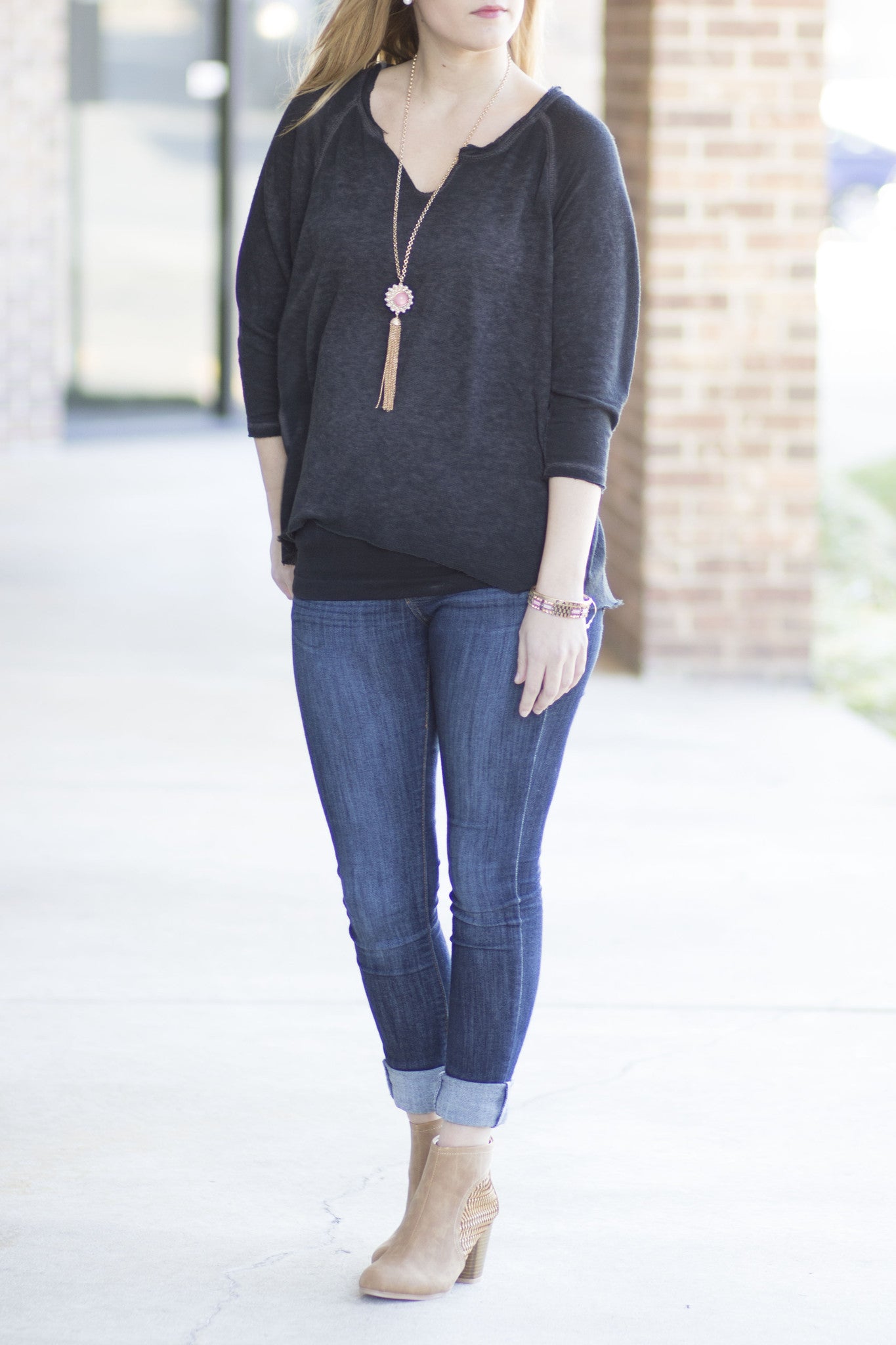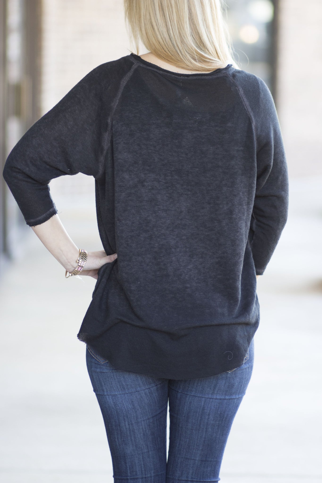 This 3/4 length super soft slouchy tee is perfect for the stylish casual outfit. Fits true to size. The color is a dark gray burnout.